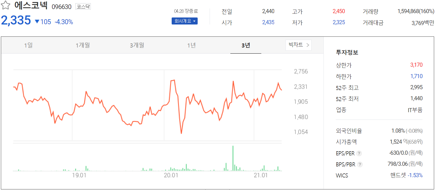 4월 28일 장종료 기준 당사의 주가는 전일보다 4.3% 내린 2,335원에 거래를 마쳤습니다. 외국인 비중은 1.08%이며, 시가 총액 1,524억 원으로 코스닥 시총 상위 658위 종목입니다.