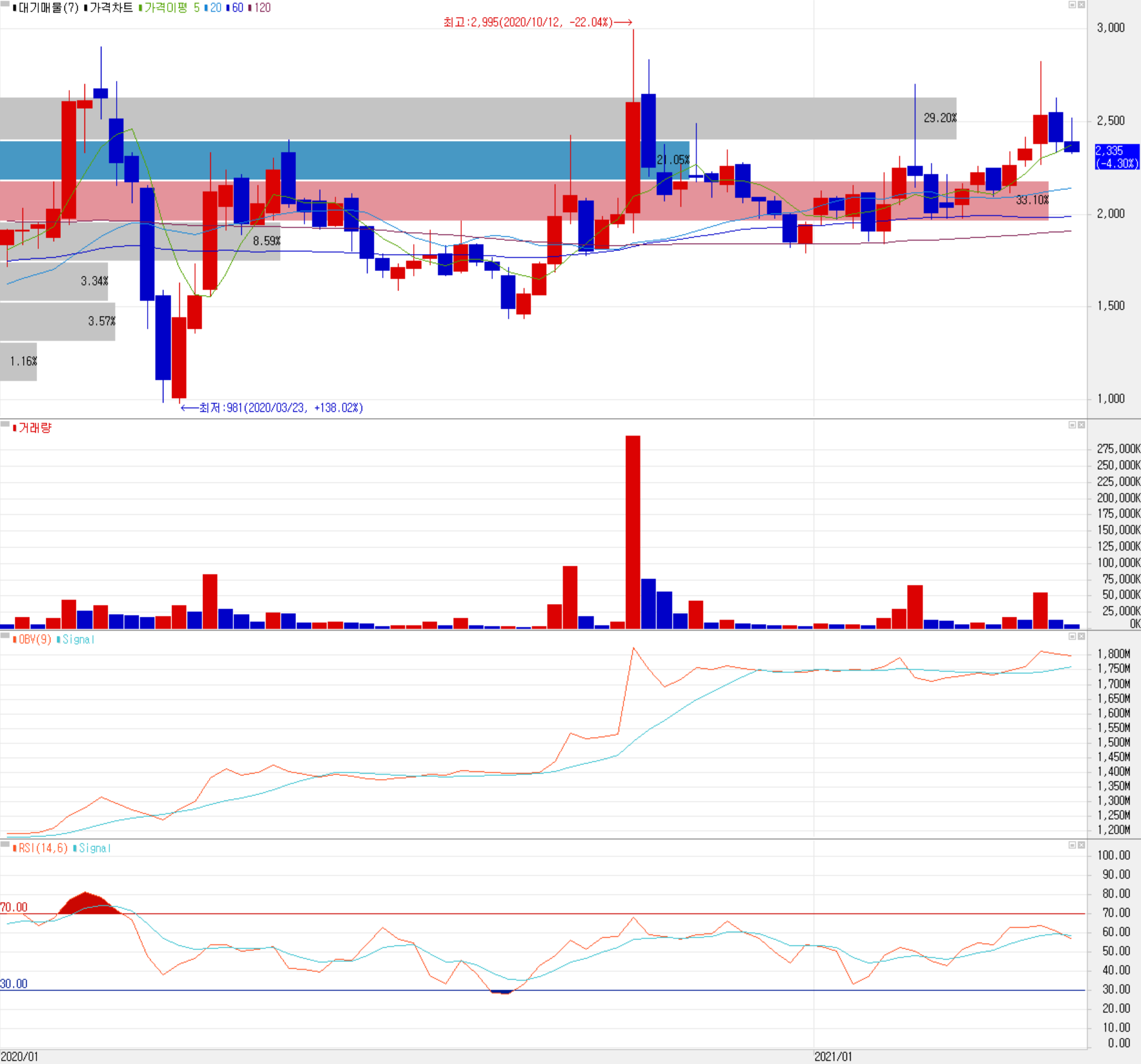 주봉상 전반적으로 상승 추세를 보이고 있으나 진입시기는 좀 더 지켜본 후 결정하는 게 좋을 듯합니다.
