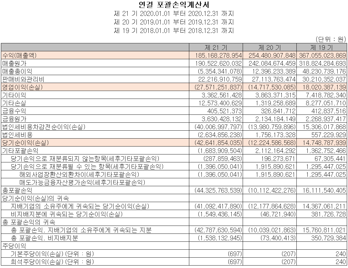 당사의 2020년 실적은 매출액 1,852억 원으로 전년 대비 27.2% 감소했고, 영업손실 275억 원, 당기순손실 426억 원으로 전년도에 이은 적자 지속을 기록했습니다. 주 고객사의 중국사업부 철수와 중저가 라인의 통폐합 및 코로나19의 영향 등이 매출 감소와 영업손실이 지속되는 원인으로 파악됩니다.