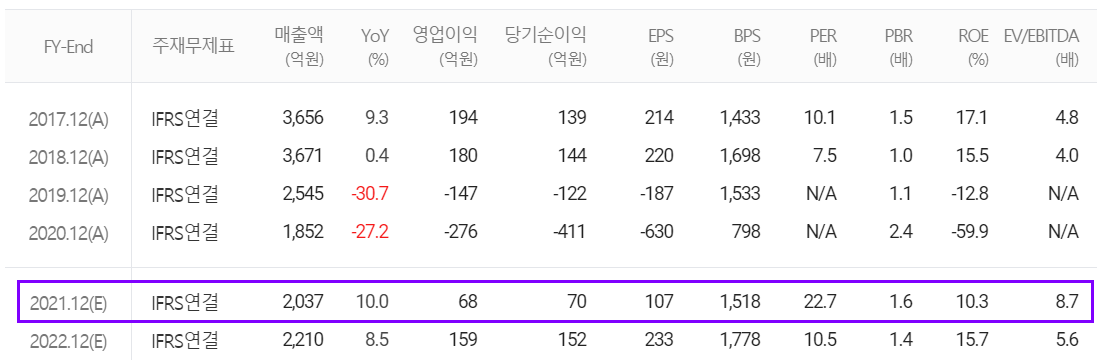 당사의 2021년 예상 실적은 매출액 2,037억 원으로 전년 대비 10% 증가하고, 영업이익 68억 원, 당기순이익 70억 원을 기록하면서 턴어라운드 할 것으로 추정했습니다. 폴더블 폰 힌지 공급, 수소 사업 진출, 2차전지 사업 등의 전망에 따른 것으로 파악됩니다.