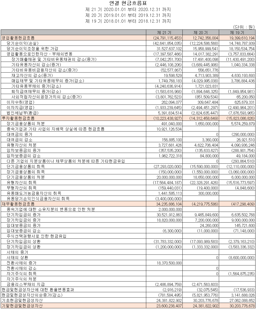 2년 연속 적자 지속으로 영업활동 현금흐름은 248억 원이 유출되었고, 차입금을 조달하여 부채를 상환하였으며 유무형 자산을 취득하였습니다. 2020년 당기 말 기준 당사의 현금 및 현금성 자산은 236억 원입니다.