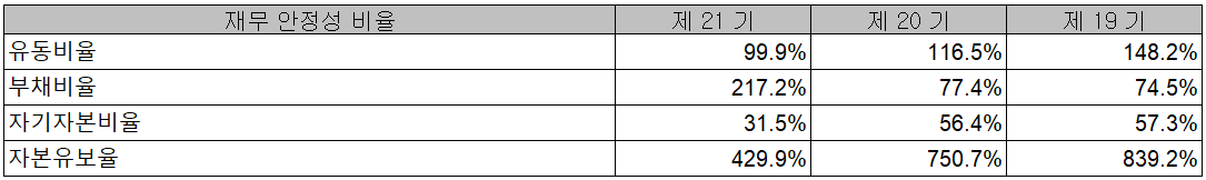 2020년 에스코넥의 주요 재무 안정성 비율에서는 유동비율 99.9%, 부채비율 217.2%, 자기자본비율 31.5%, 자본유보율 429.9%를 기록하였습니다. 주로 휴대폰 사업부문의 저조한 실적으로 부채비율이 크게 증가하면서 전기 대비 재무상태가 나빠졌습니다.