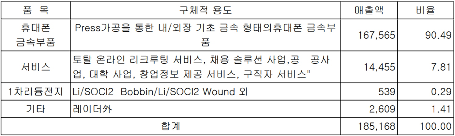 당사의 주요 사업부문은 핸드폰 금속부품 제조부문, 1차전지 제조부문, 2차전지 금속부품 사업부문, 친환경 수소 사업부문 그리고 인터넷 채용 솔루션 등의 서비스 사업부문 등으로 구성되어 있습니다. 또하 기타 근거리 감시체계용 레이더는 영국 BSS사와 파트너로 국내 레이더 판매와 유지보수를 담당하고 있습니다.