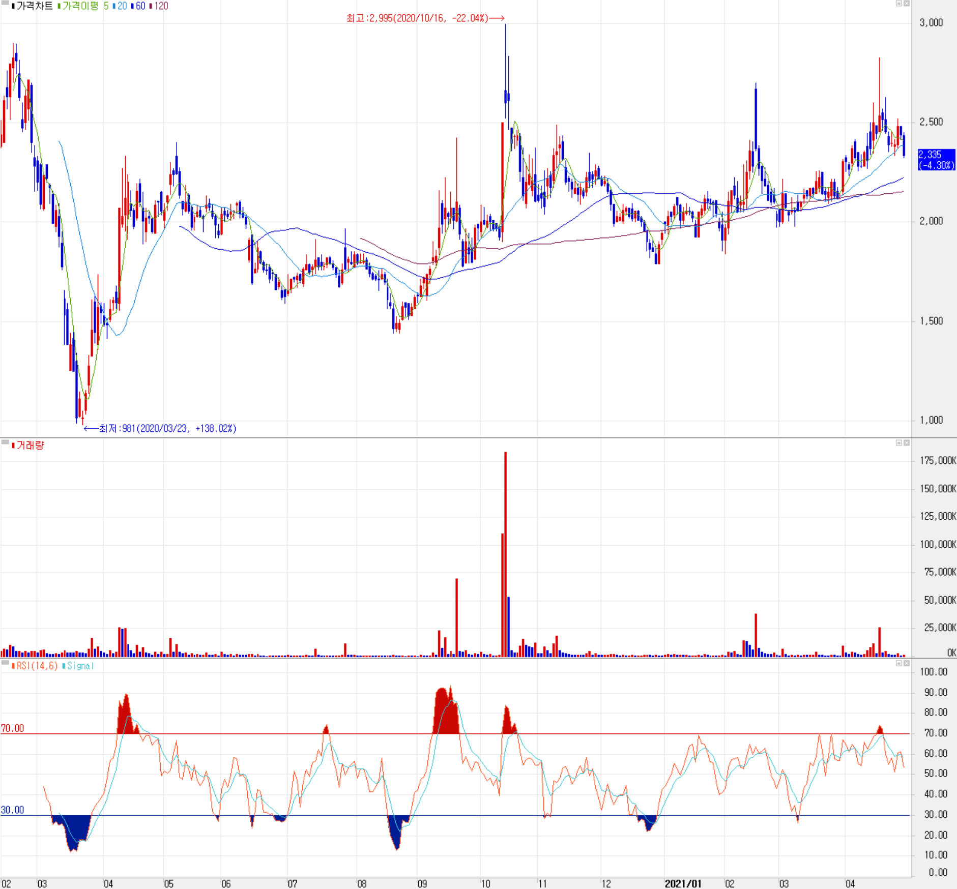코로나19로 인한 급락 이후 회복세를 보이던 주가는 삼성전자 중국 스마트폰 사업 열세에 따른 당사의 실적 부진으로 주가가 하향세를 보이다가 10월 들어서면서 정부의 수소연료전지 발전 전력 의무화 제도 발표에 따라 주가는 최고치인 2,995원을 기록한 후 다시 조정을 받기 시작했고 2월 들어서 삼성전자 스마트폰 라인업 강화 조치에 따른 상승이 있었으나 반락 후 4월 들어서면서 2차전지의 핵심 부품인 CID(배터리 안전소자)가 삼성SDI 승인을 받은 후 공급 중이라는 소식에 급등했습니다. 최근 수급에서는 개인의 매수 우위 속에 외국인과 공방을 하는 모습으로 기관의 거래는 둔화된 모습을 보이고 있습니다. 예상 실적 및 차트 소견을 종합한 개인적인 목표주가는 2,600원으로 상승 시 2,420원 부근에서 저항이 예상되며, 추가 하락 시에는 2,250원을 지지하는지 확인 후 접근할 예정입니다.