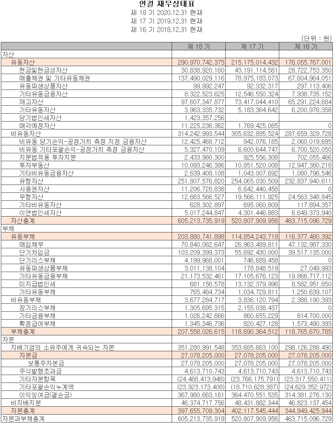 2020년 당기 말 당사의 자산은 전년보다 16.2%(844억) 증가한 6,052억 원으로 매출 채권, 재고 자산의 증가 및 중국 현지 법인 청산예정에 따른 매각 예정 자산 등의 증가가 있었습니다. 부채는 전기 대비 74.9%(889억) 증가한 2,076억 원으로 매입채무와 차입금의 증가가 주된 요인입니다.