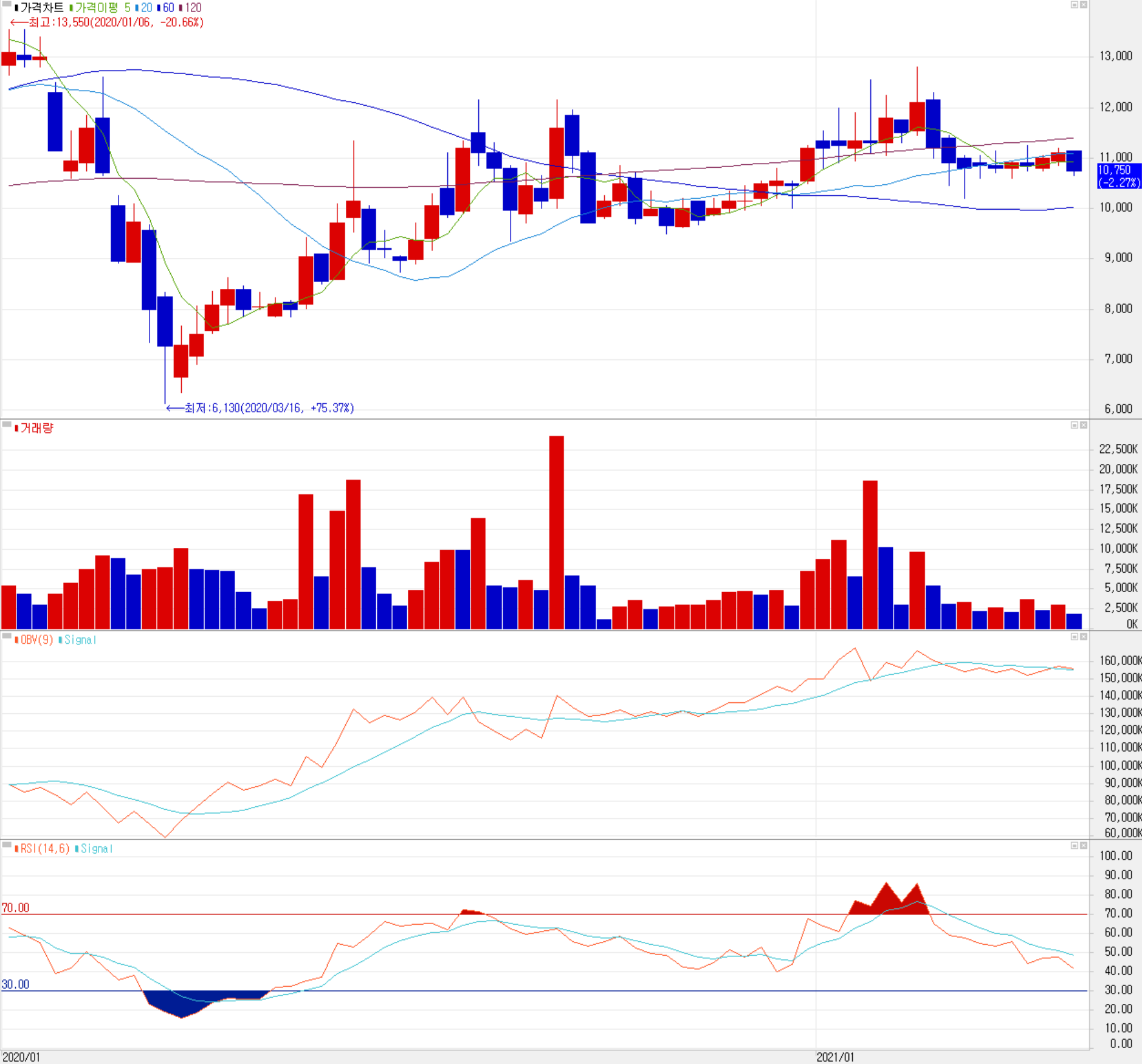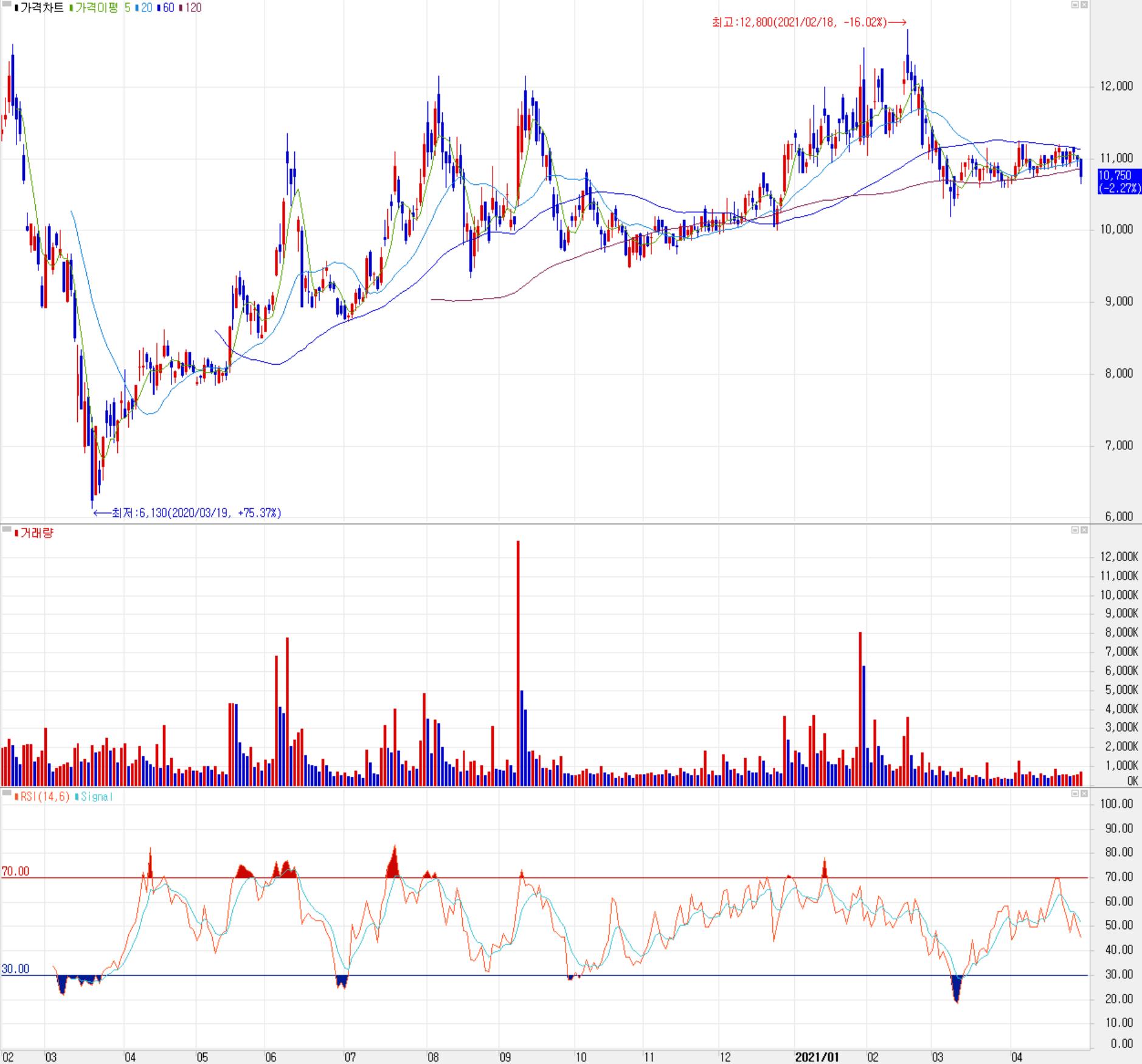 코로나19로 급락했던 지난해 3월 이후 다아의 주가는 꾸준히 상승하면서 올해 2월 들어 최고점인 12,800원을 기록한 후 조정을 받았고, 3월 중순부터는 11,000원 부근에서 횡보하는 모습입니다. 최근 수급에서는 개인의 매수 우위 가운데 주체 간 수급 공방이 치열한 편입니다. 향후 전망 및 차트 소견을 종합한 개인적인 목표주가는 14,000원으로 설정하고, 조정 시에는 10,300원 부근에서 1차 지지, 상승 시 11,700원 부근에서의 저항을 보고 있습니다.