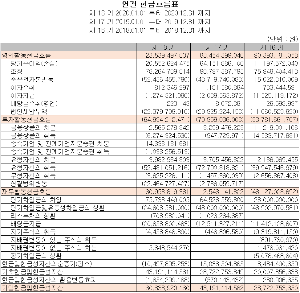 영업활동으로 꾸준히 현금을 창출하고 있으나, 당기에는 이익의 감소에 따라 전년 대비 599억 원이 감소한 235억 원의 현금이 유입되었습니다. 투자활동에서는 중국 연태 현지법인 청산, 설비 투자 등을 진행하였습니다. 재무활동에서는 차입금을 조달하여 부채를 상환하고, 자기 주식의 취득과 배당금을 지급하였습니다. 2020년 당기 말 기준 당사의 현금 및 현금성 자산은 전년보다 124억 원 감소한 308억 원입니다.