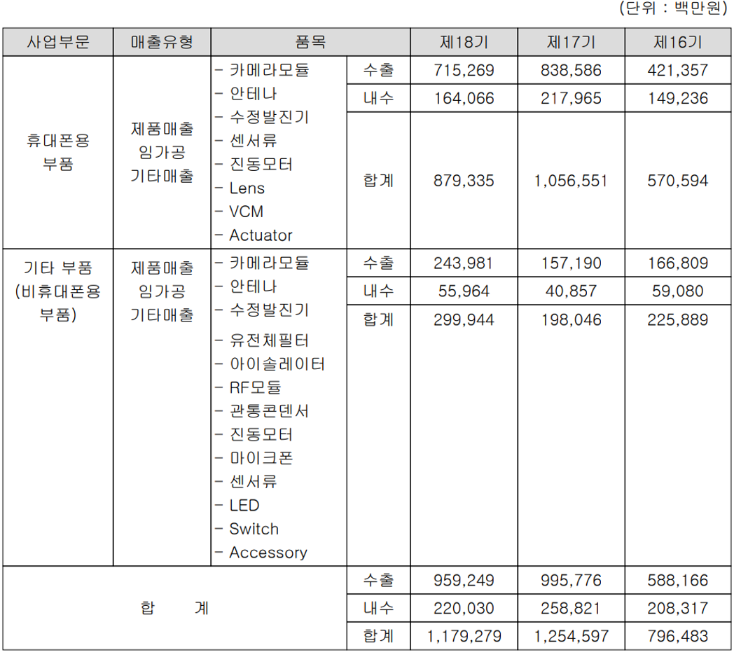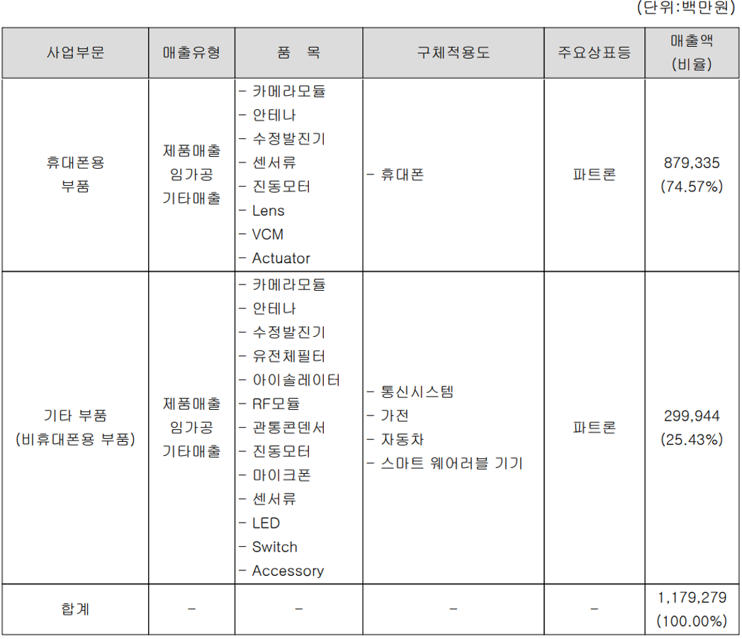 당사는 전자부품 관련 하나의 사업부문으로 구성되어 있으며, 크게 카메라 모듈, 안테나 등의 부품을 제조하는 휴대폰 부품과 기타 휴대폰 부품을 제외한 통신, 가전제품, 자동차 전장 및 웨어러블 기기 등의 부품으로 구분됩니다. 지난해 당사의 휴대폰 관련 부품 실적은 전체 매출의 74.57%를 차지하였습니다.