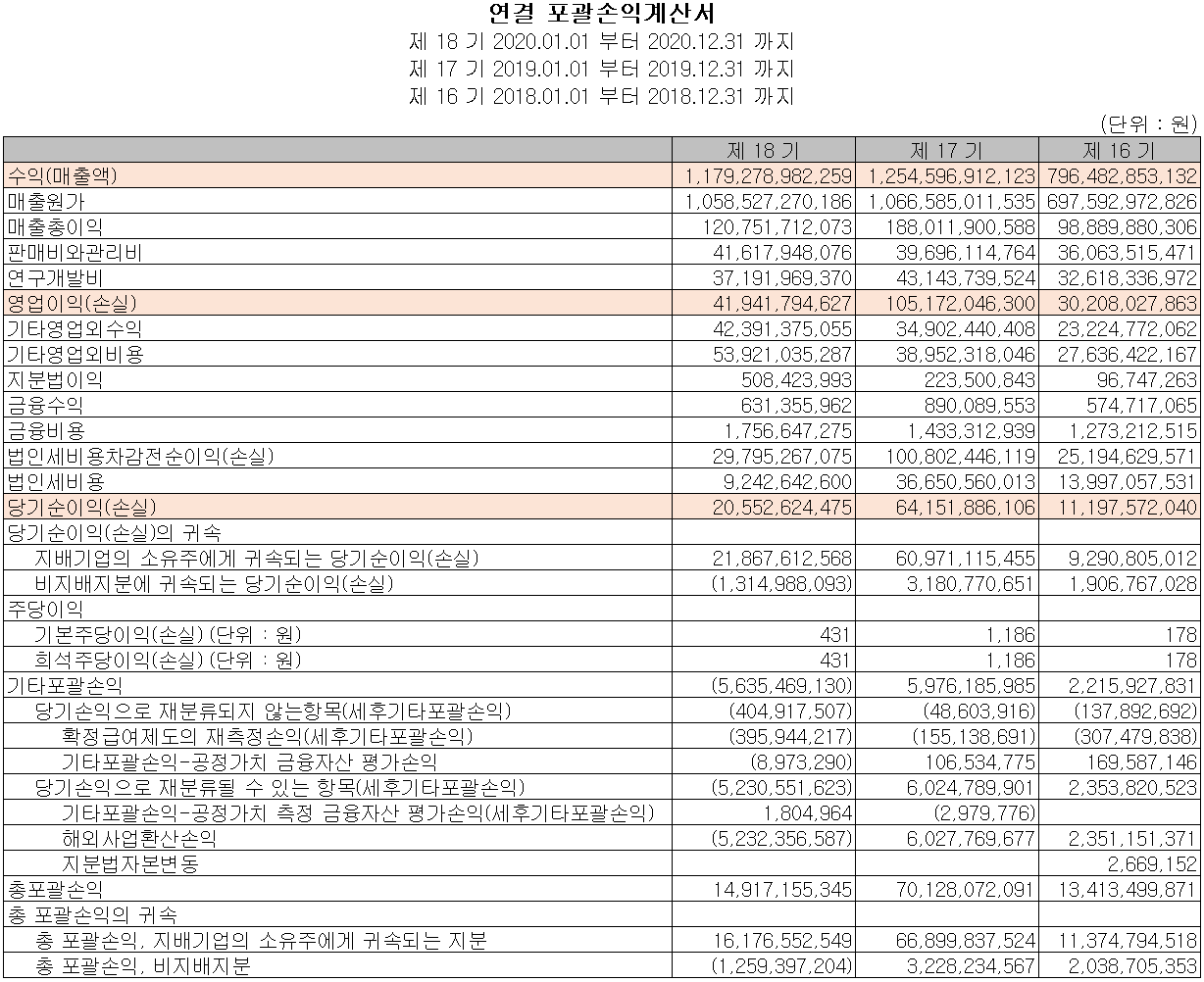 당사의 2020년 실적은 매출액 1조 1,793억 원으로 전년 대비 6% 감소했고, 영업이익은 419억 원으로 60.1% 감소, 당기순이익은 206억 원으로 68% 감소했습니다. 코로나19의 영향에서도 전반적인 매출은 양호한 수준을 유지했으나, 카메라 모듈 산업의 경쟁 심화 및 재료 원가의 상승 등으로 이익이 부진했습니다. 또한 계열사인 엘컴텍의 종속회사 AGM의 라이선스가 환경부 지적으로 취소되었으나, 현재 소송 중에 있으며 이에 해당하는 약 81억 원 규모의 탐사자산을 손상 처리하였습니다.
