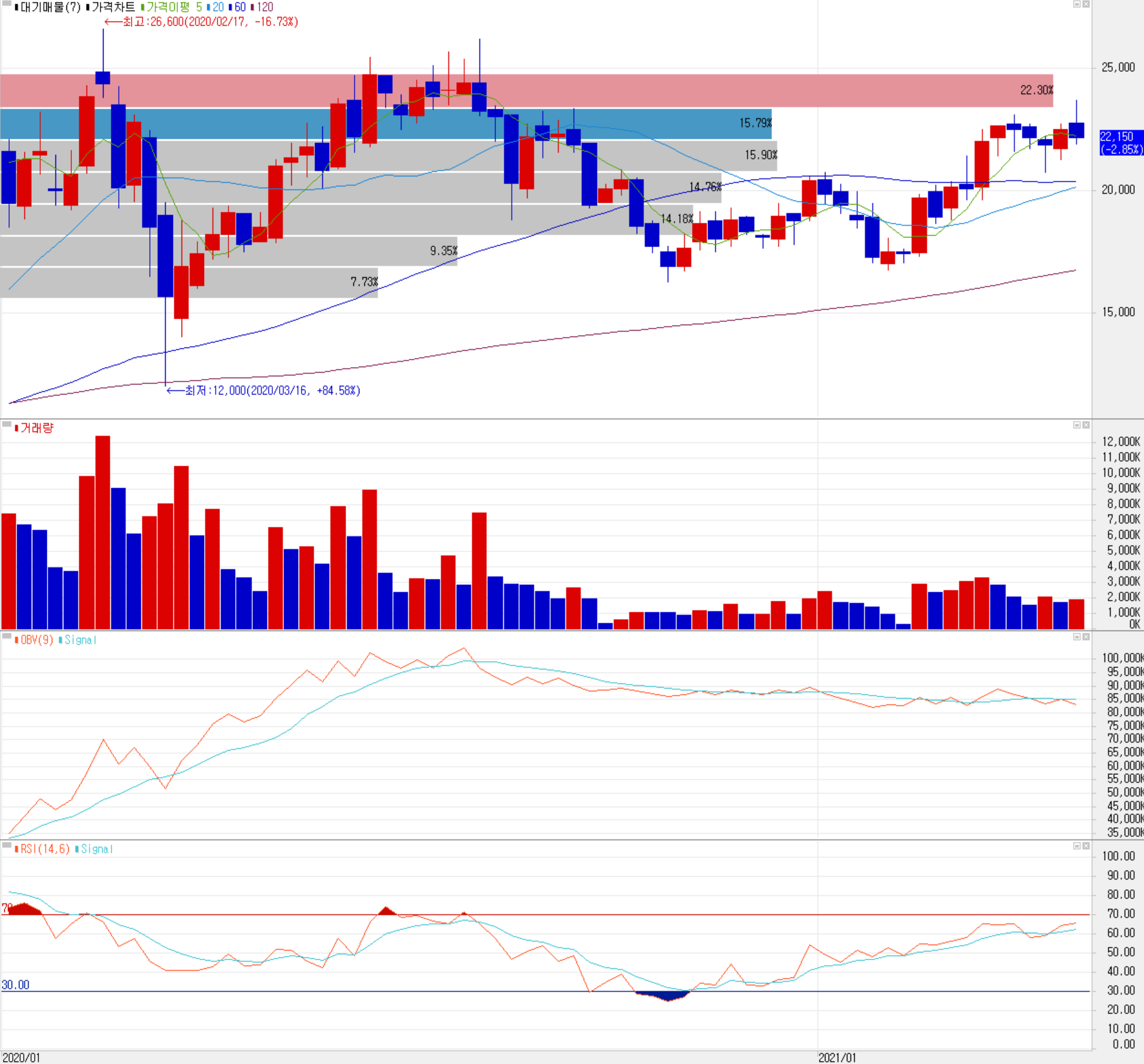 코로나19 팬데믹으로 인한 급락 이후 빠르게 회복한 주가는 실적 회복이 더디면서 올해 2월 중순까지 잦은 변동성을 보인 가운데 하락세를 면치 못했습니다. 2월부터는 주 고객사의 중저가 폴더블 폰도 출시한다는  소식에 최근까지 상승곡선을 그리다가 2 거래일 연속 하락 마감했습니다. 수급에서는 지난 4월 26일까지 외국인의 9 거래일 순매수 행진이 이어지는 등 외국인의 매수세가 유입되는 상황에 개인과 기관은 매도 우위를 유지하고 있습니다. 예상 실적 및 차트 소견에 의한 개인적인 목표주가는 25,500원으로 설정하였고, 하반기 폴더블 폰 수요에 대한 실적 개선이 예상되는 만큼 시간을 가지고 조정 시 매수하는 전략을 생각하고 있습니다.