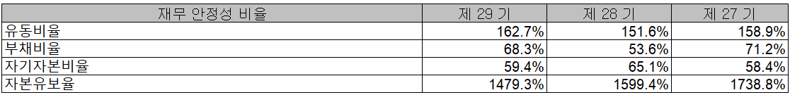 2020년 당사의 재무 안정성 비율에서는 유동비율 162.7%, 부채비율 68.3%, 자기자본비율 59.4%, 자본유보율 1479.3%를 기록하면서 전년 대비 부채비율의 증가가 있었으나 전반적으로 양호한 재무상태를 유지하고 있습니다.