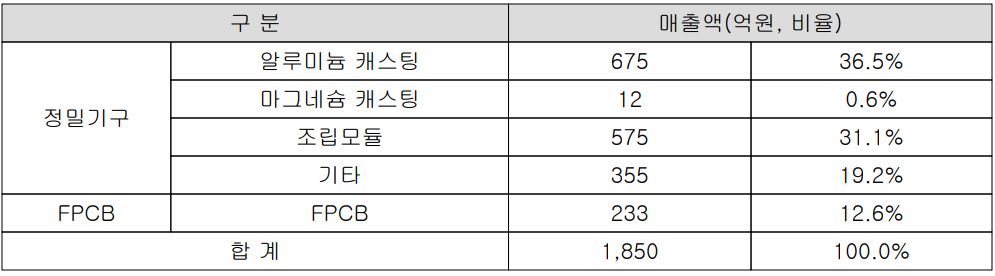 당사의 사업부문은 크게 자체 금형기술 기반의 스마트폰 기구부품 및 폴더블 폰의 힌지 등 정밀기구 사업부문과 FPCB(Flexible Printed Circuit Board, 연성회로기판) 사업부문으로 구분됩니다. 스마트폰 프레임에 해당되는 알루미늄 캐스팅의 매출은 전체 매출의 36.5%를 차지했고, 폴더블 폰의 힌지, 모션 모듈 같은 조립모듈이 31.1%, FPCB 부문이 12.6%의 매출 비중을 보였습니다.
