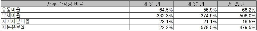 2020년 당사의 재무 안정성 비율에서는 유동비율 64.5%, 부채비율 332.3%, 자기자본비율 23.1%, 자본유보율 22.2%를 기록하였습니다. 부채비율과 규모는 꾸준히 감소세를 보이고 있으나, 전반적인 재무 비율 면에서는 좋은 수치는 아니고, 부채비율도 여전히 300%가 넘어 리스크가 있다고 판단됩니다. 전기차 등 친환경 차량 및 신차에 대한 수익성 있는 부품 공급과 함께 고객사 다변화를 통한 매출 증대가 필요한 상황입니다.