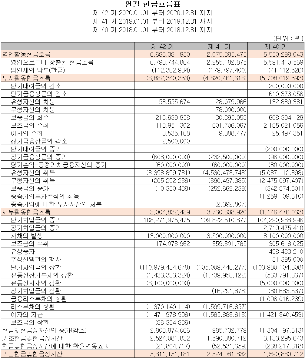 당사의 영업활동으로 인한 현금흐름은 전기보다 46억 원이 증가한 67억 원이 유입되었습니다. 적자 전환이 지속되는 가운데 차입금의 조달 및 사채를 발행하여 부채를 상환하고, 설비 및 연구 개발 투자를 지속적으로 수행하고 있습니다. 2020년 당기 말 기준 현금 및 현금성 자산은 전기보다 28억 원 증가한 53억 원입니다.