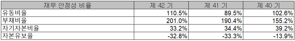 당사의 2020년 재무 안정성 비율에서는 유동비율 110.5%, 부채비율 201%, 자기자본비율 33.2%, 자본유보율 -32.8%를 기록했습니다. 적자 지속으로 인해 결손금이 발생하면서 자본잠식률이 22.76%로 일부 자본 잠식 상태입니다. 다만 2020년 3분기부터 흑자 전환하였고, 당기 중 신제품과 신규 사업의 연구 개발에 따른 향후 실적 개선이 기대됩니다.