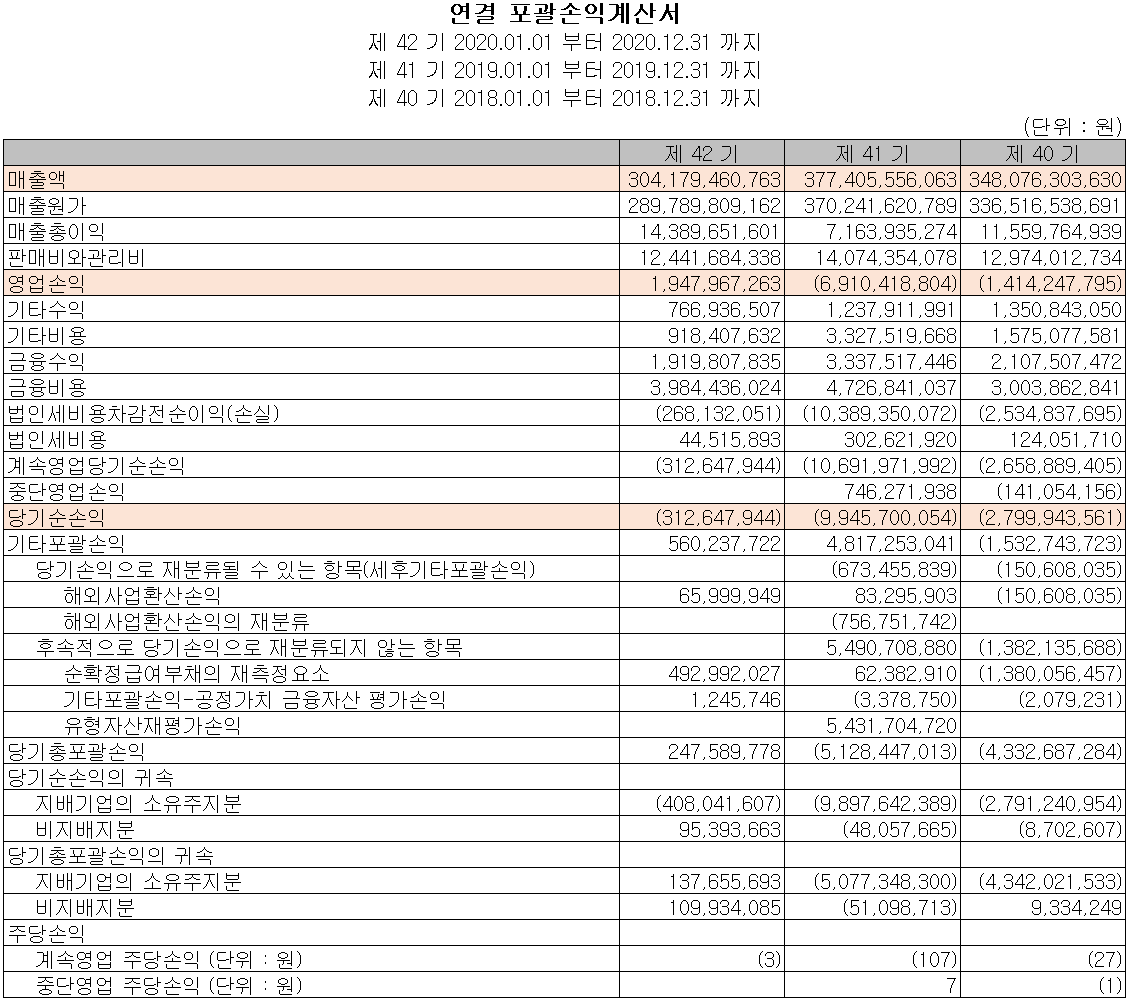 당사의 2020년 실적은 매출액 3,042억 원으로 전년 대비 19.4% 감소했고, 영업이익은 19억 원으로 흑자 전환, 당기순손실 3억 원으로 적자 지속입니다. 코로나19 장기화로 인한 수요 감소에 따라 매출이 감소했으나, 사내 생산성 향상 및 고정비 절감 노력에 따른 영업이익과 당기순손실의 개선이 있었습니다.