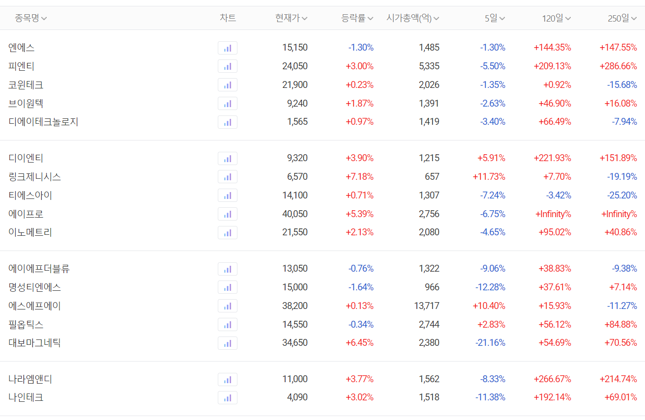 2차전지 장비 관련주 주간 시황(자료: 다음 금융)