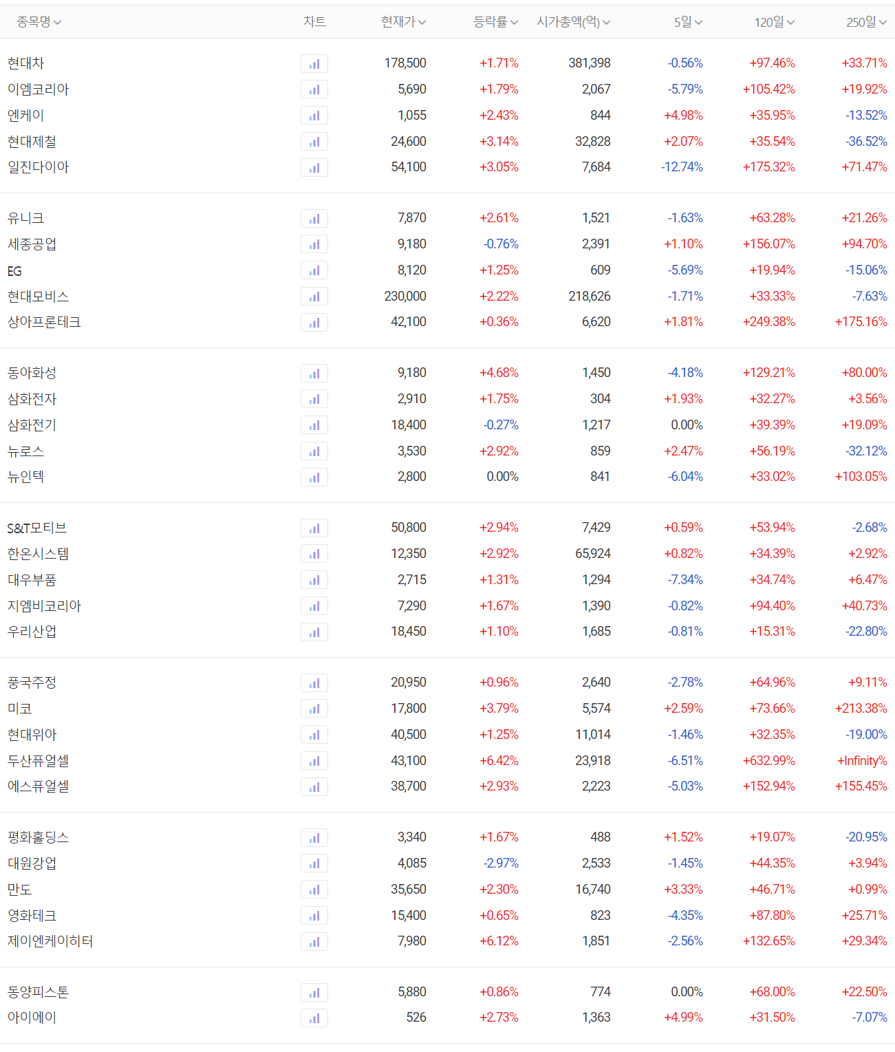 수소차(수소 연료 전지) 관련주 대장주 주간 시황