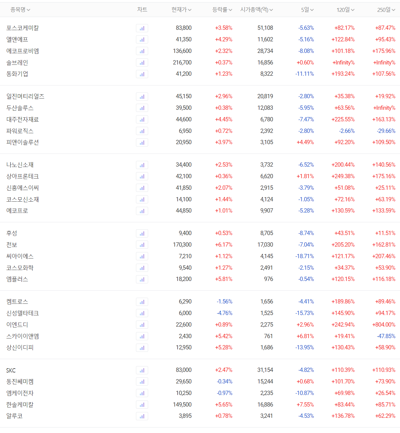 2차전지 소재 관련주 주간 시황(자료: 다음 금융)
