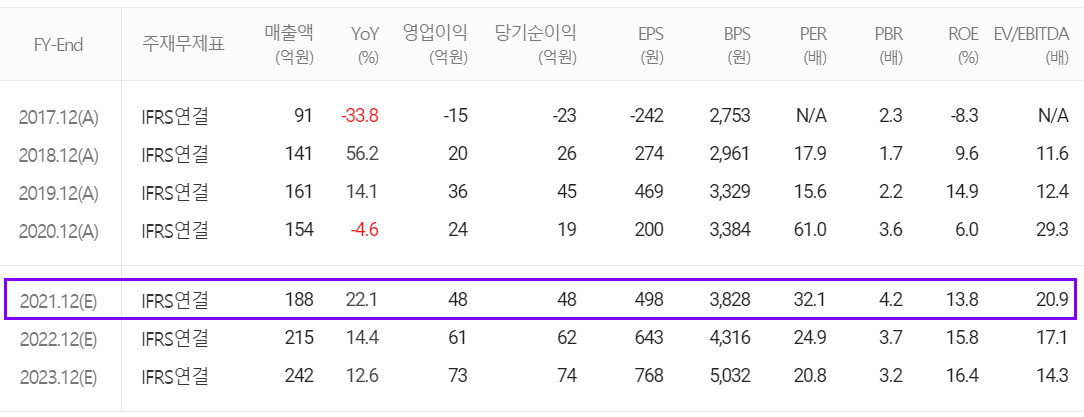 당사의 2021년 예상 실적은 매출액 188억 원으로 전년 대비 22.1% 증가하고, 영업이익은 48억 원으로 100% 증가, 당기순이익 48억 원으로 152.6% 증가할 것으로 추정했습니다.