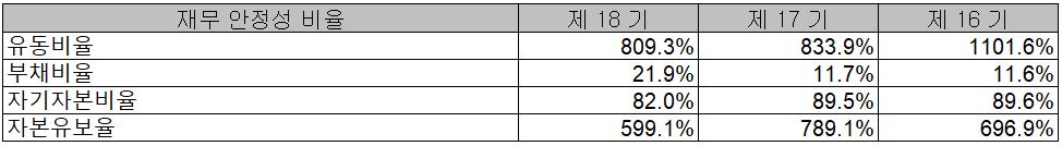 당사의 2020년 재무 안정성 비율에서는 유동비율 809.3%, 부채비율 21.9%, 자기자본비율 82%, 자본유보율 599.1%를 기록하면서 유동성이 풍부하고 무차입 경영으로 안정적인 재무상태를 유지하고 있습니다.