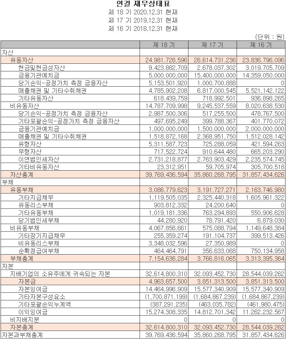 2020년 당기 말 자산총계는 전기 대비 10.9%(39억 원) 증가한 398억 원으로 현금성 자산 및 공정가치 금융자산의 증가가 있었습니다. 부채는 89.9% 증가하면서 72억 원으로 리스 부채의 증가에 따른 것입니다. 당기 중 11억 원 규모의 무상증자를 실시하면서 자본금은 늘어나고, 자본잉여금은 감소했습니다.