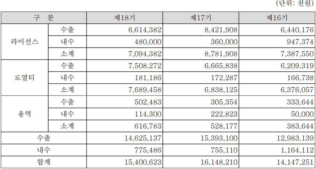 라이선스의 경우 수출은 93.2%, 내수 6.8%의 비중을 보였고, 로열티는 수출 97.6%, 내수 2.4%의 비중입니다. 전반적으로 수출은 95%, 내수 5%의 비중으로 수출이 절대적인 부분을 차지하고 있습니다.