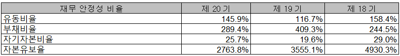 당사의 2020년 재무 안정성 비율에서는 유동비율 145.9%, 부채비율 289.4%, 자기자본비율 25.7%, 자본유보율 2,763.8%를 기록하였습니다. 부채비율은 전년 대비 대폭 감소하였지만 여전히 높은 비율을 유지하고 있습니다. 비용 투자를 감행하면서 신제품 개발 및 인도 등 신흥국에 진출한 효과를 매출로 나타내고 있으며, 파생상품 평가손실로 회계적으로 손실이 발생하였기 때문에 2021년 당사의 실적의 턴어라운드를 기대할만합니다.