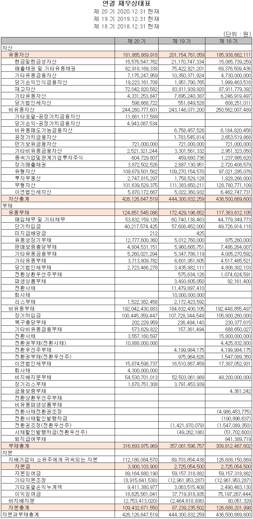 2020년 당기 말 자산 총계는 전년 대비 4.1% 감소한 4,261억 원으로 현금 및 현금성 자산의 감소, 매출 채권의 감소 및 악성 재고의 감소 등이 주요 요인입니다. 부채는 전년 대비 11.3% 감소한 3,167억 원으로 차입금 및 매입 채무 등의 감소가 있었습니다.