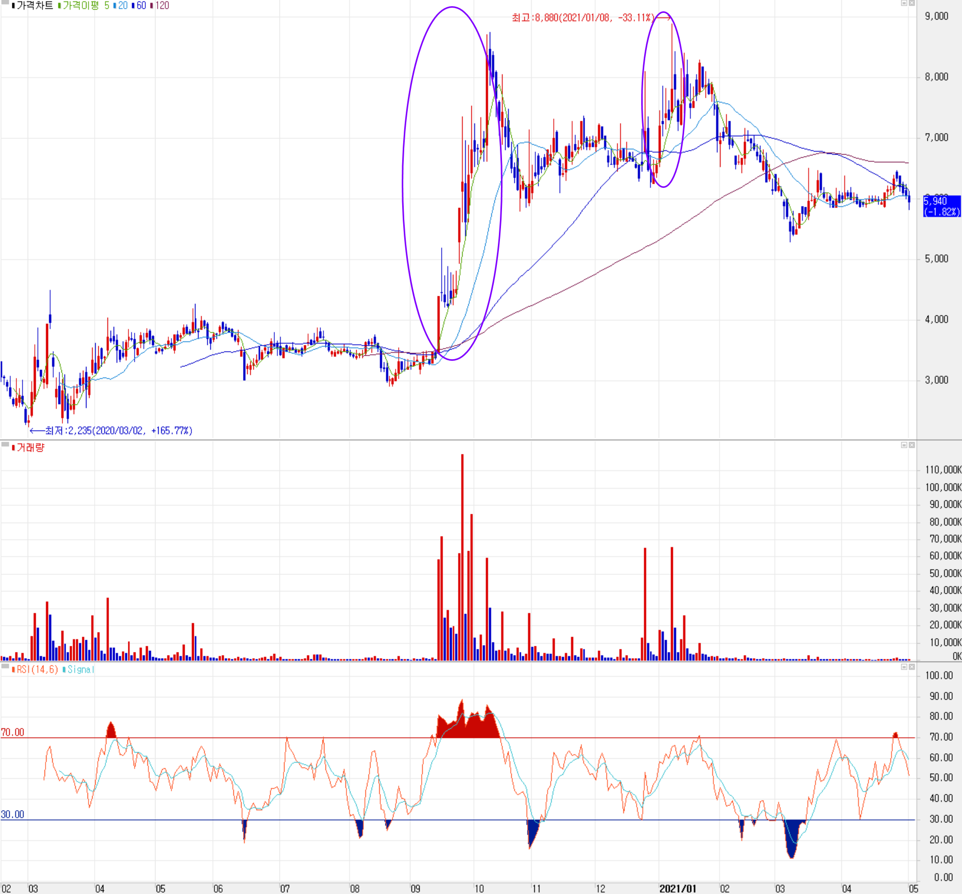 지난해 3월 코로나19로 인한 급락 후 빠른 회복을 한 주가는 9월 중순까지 3,000~4,000원 사이에서 박스권 등락을 반복하다가 9월 중순 이후 스마트카, 자율주행 테마에 따른 가파른 상승세를 보인 후 1월 초반에 최고가인 8,880원일 기록했고, 시장 수급 변동에 따른 조정을 받다가 최근에는 6,000원 부근을 유지하고 있습니다. 최근 수급에서는 기관계의 매수세가 유입되는 가운데 외국인도 소폭 매수 우위를 보이고 있습니다. 차트 관점에서 개인적인 목표 주가는 7,000원으로 수정하고, 상승 시 6,600원에서 저항이 예상됩니다. 추가 하락 시에는 오늘 장중 저점 부근인 5,800원 선을 지키는지 보고 접근하는 게 좋겠습니다.
