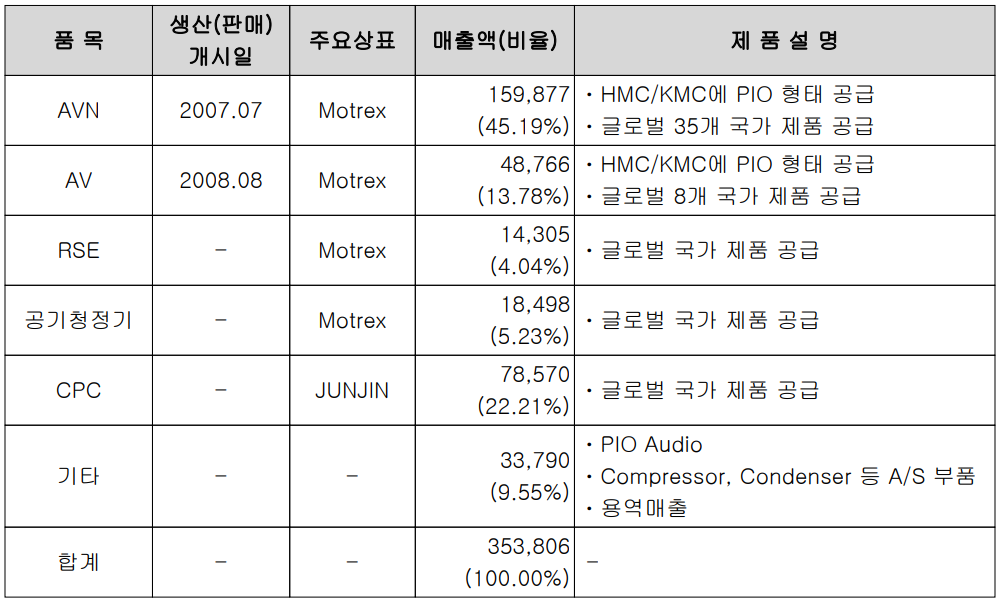 당사는 차량용 전장 제품을 제조하는 기업으로서, 운전자와 차량의 소통을 위한 차량용 HMI(Human Machine Interface) 기술을 바탕으로 AVN(Audio Video Navigator), AV, RSE(Rear Seat Entertainment), 공기 청정기 등 IVI 시스템을 제조 공급하고 있으며, DashCam, Sensor 등 자율주행을 위한 ADAS 시스템을 공급하고 있습니다. 지난해 당사의 주력 제품인 AVN의 매출은 전체 매출액의 45.19%를 차지하였고, AV 13.78%, RSE 4.04%, 공기청정기 5.23% 등입니다. 또한 종속회사 전진중공업의 주력 사업인 CPC(Concrete Pump Car)의 매출 비중은 22.21%를 차지하고 있습니다. 당사의 IVI 시스템 관련 제품은 대부분 PIO(Port Installed Option) 또는 DIO(Dealer Installed Option) 방식으로 판매를 하면서 자율주행 플랫폼을 공급하는 회사로 도약을 하고 있습니다.