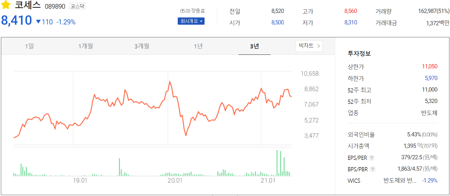 5월 3일 장 종료 기준 당사의 주가는 전 거래일보다 1.29% 내린 8,410원에 거래를 마쳤습니다. 외국인 비중은 5.43%이며, 시가 총액 1,395억 원으로 코스닥 시총 상위 707위 종목입니다.