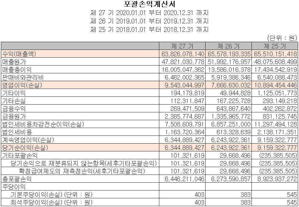 당사의 2020년 실적은 매출액 638억 원으로 전년 대비 2.7% 감소하였으며, 영업이익은 95억 원으로 24.5% 증가, 당기순이익은 63억 원을 기록하면서 전기 대비 1.6% 증가하였습니다. 레이저 응용장비의 제조 노하우로 인해 제조원가가 감소하면서 영업이익이 증가하였습니다. 반면 환율 변동으로 환차손이 발생하면서 당기순이익은 소폭 증가하는데 그쳤습니다.