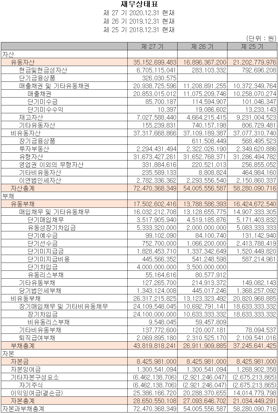 2020년 당기 말 자산총계는 전기 대비 34.2%(185억 원) 증가한 725억 원으로 하반기 매출 증가로 인한 매출 채권과 재고 자산의 증가가 주요 요인입니다. 부채는 전년 대비 62.8% 증가한 438억 원으로 주로 차입금 조달에 따른 증가 요인입니다. 자본총계는 전기 대비 16억 원이 증가한 287억 원으로 당기순이익에 따른 증가가 있었고, 자사주 취득에 35억 원을 반영하여 자본 감소가 있었습니다.