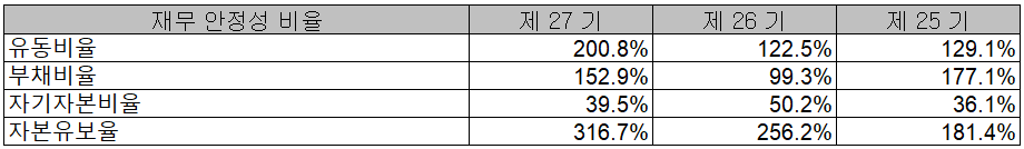 당사의 2020년 재무 안정성 비율에서는 유동비율 200.8%, 부채비율 152.9%, 자기자본비율 39.5%, 자본유보율 316.7%를 기록하였습니다. 부채비율이 크게 증가하였으나 주요 요인이 매출 채권에서 발생하여 회수 후 부채비율은 낮아질 것으로 기대합니다.