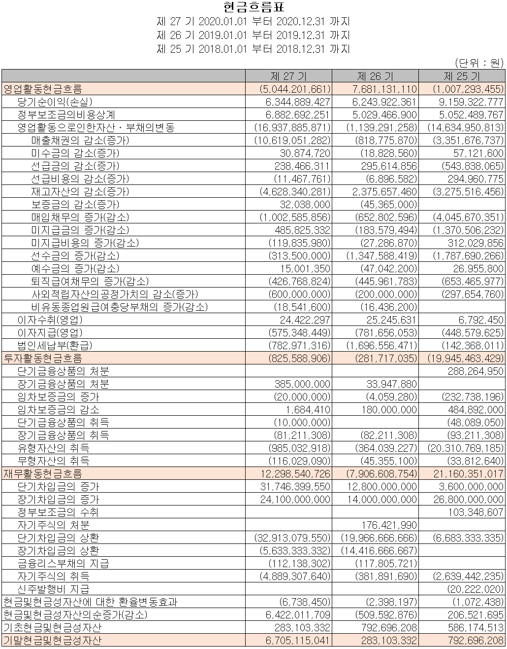 당기 중 매출 채권 증가, 재고 자산의 증가 등으로 영업활동 현금흐름에서는 50억 원이 유출되었으며, 차입금을 조달하여 부채를 상환하고 주주가치 제고를 위한 자기 주식을 취득하였습니다. 2020년 당기 말 기준 당사의 현금 및 현금성 자산은 64억 원이 증가한 67억 원입니다.