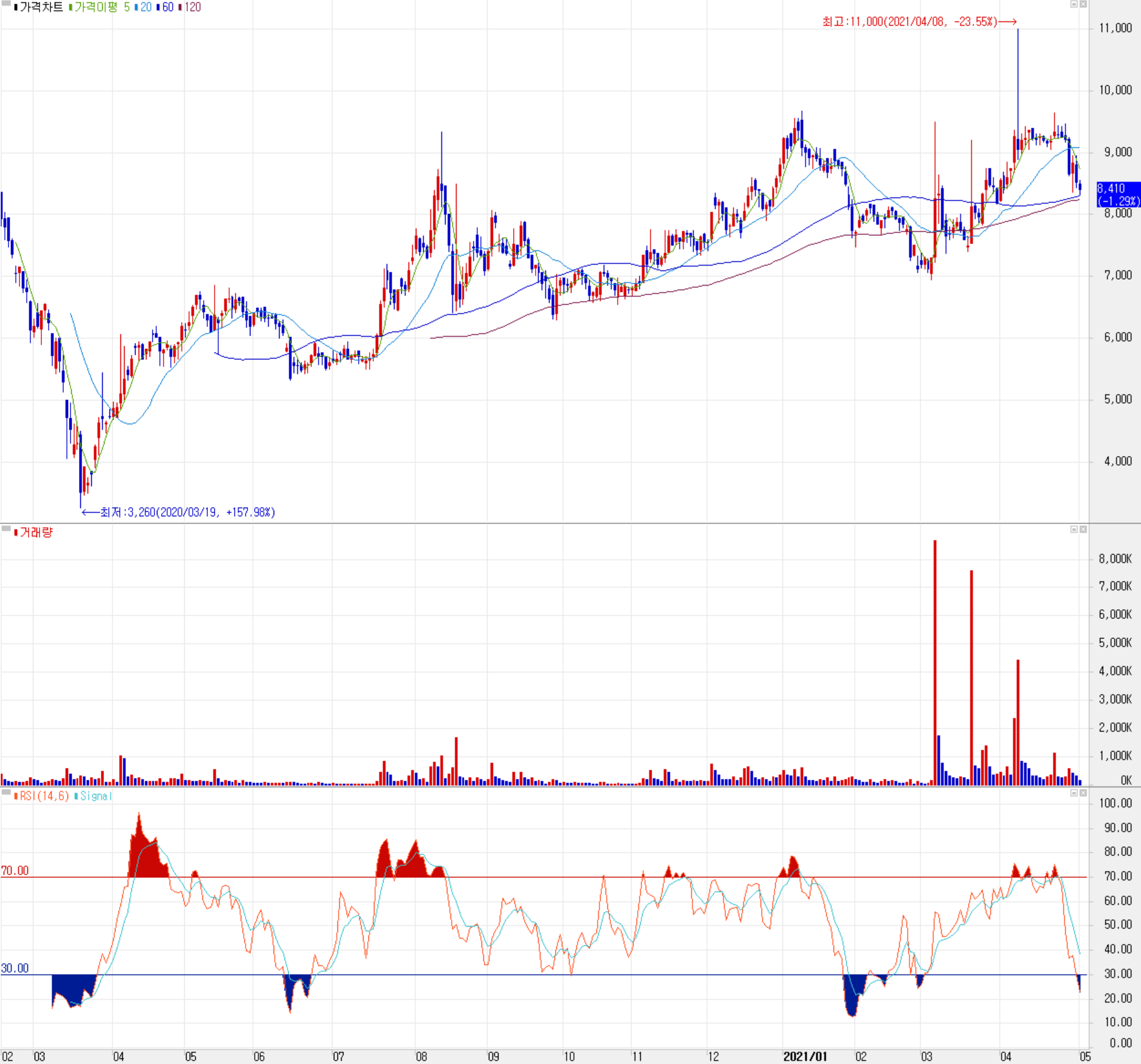5월 3일 장 종료 기준 당사의 주가는 전 거래일보다 1.29% 내린 8,410원에 거래를 마쳤습니다. 외국인 비중은 5.43%이며, 시가 총액 1,395억 원으로 코스닥 시총 상위 707위 종목입니다.