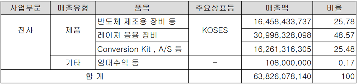 당사의 사업 부문은 크게 반도체 및 디스플레이 제조 공정용 장비, 레이저 응용 장비 및 Conversion Kit와 유지보수 등으로 구분됩니다. 지난해 반도체 제조용 장비의 매출은 전체 매출의 25.78%, 레이저 응용 장비는 48.57%, Conversion Kit 등은 25.48%의 매출 비중을 차지하였습니다.