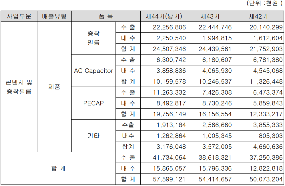 제품 별 매출 구분에서는 증착필름의 수출 비중이 90.8%, 내수 9.2%를 차지했으며, AC용 콘덴서는 수출 62%, 내수 38% 그리고 신재생에너지용 콘덴서는 수출 57%, 내수 43%의 비중을 기록했습니다.