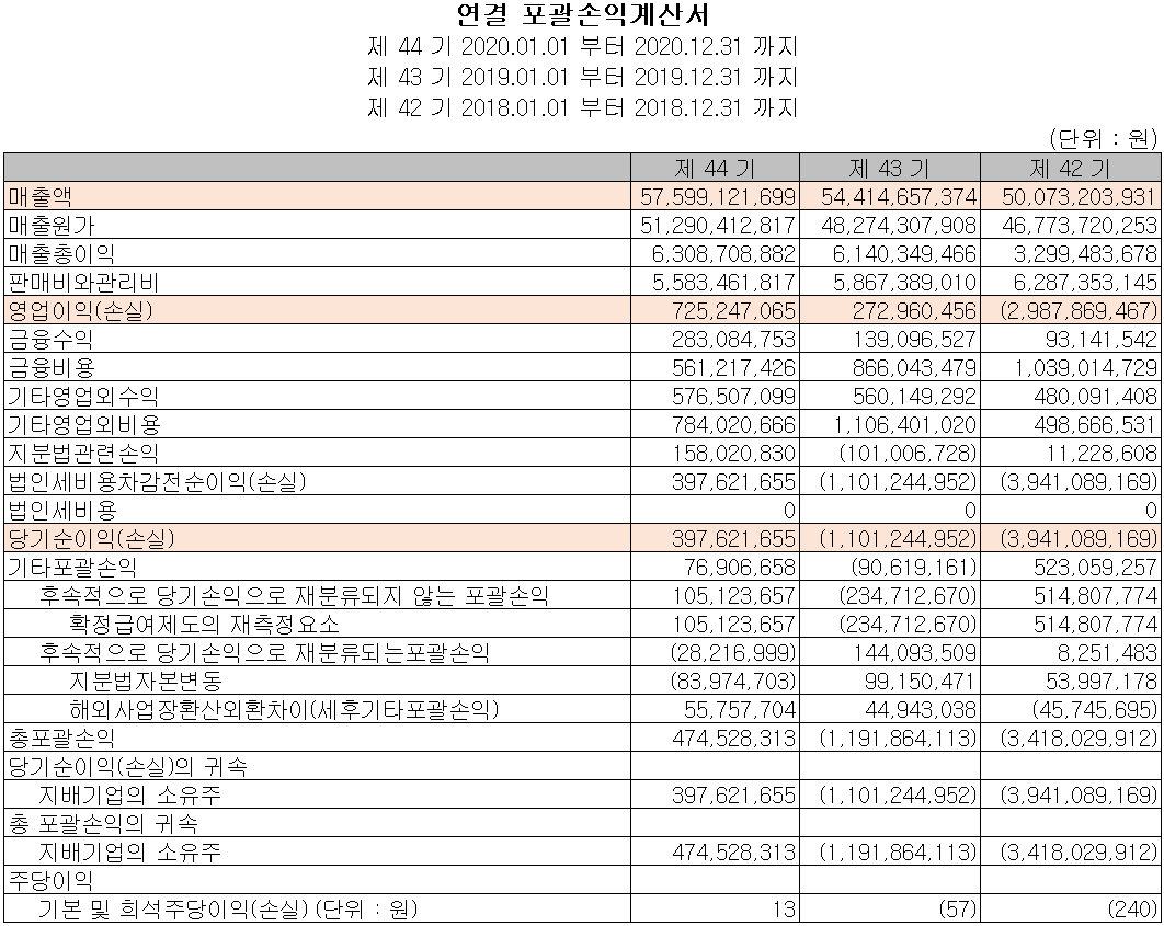 당사의 2020년 실적은 매출액 576억 원으로 전년 대비 5.9% 증가했고, 영업이익은 7억 원으로 165.7% 증가, 당기순이익은 4억 원을 기록하면서 흑자 전환했습니다. 전기기기용 콘덴서의 매출이 소폭 감소하기는 했으나 신재생에너지용(자동차용 커패시터) 콘덴서의 수요 증가에 따라 전반적인 실적이 개선되었습니다.