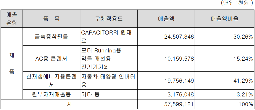 지난해 금속증착필름의 매출은 전체 매출의 30.26%, AC용 콘덴서는 15.24%, 신재생에너지용 콘덴서는 41.29%의 매출 비중을 나타냈습니다.