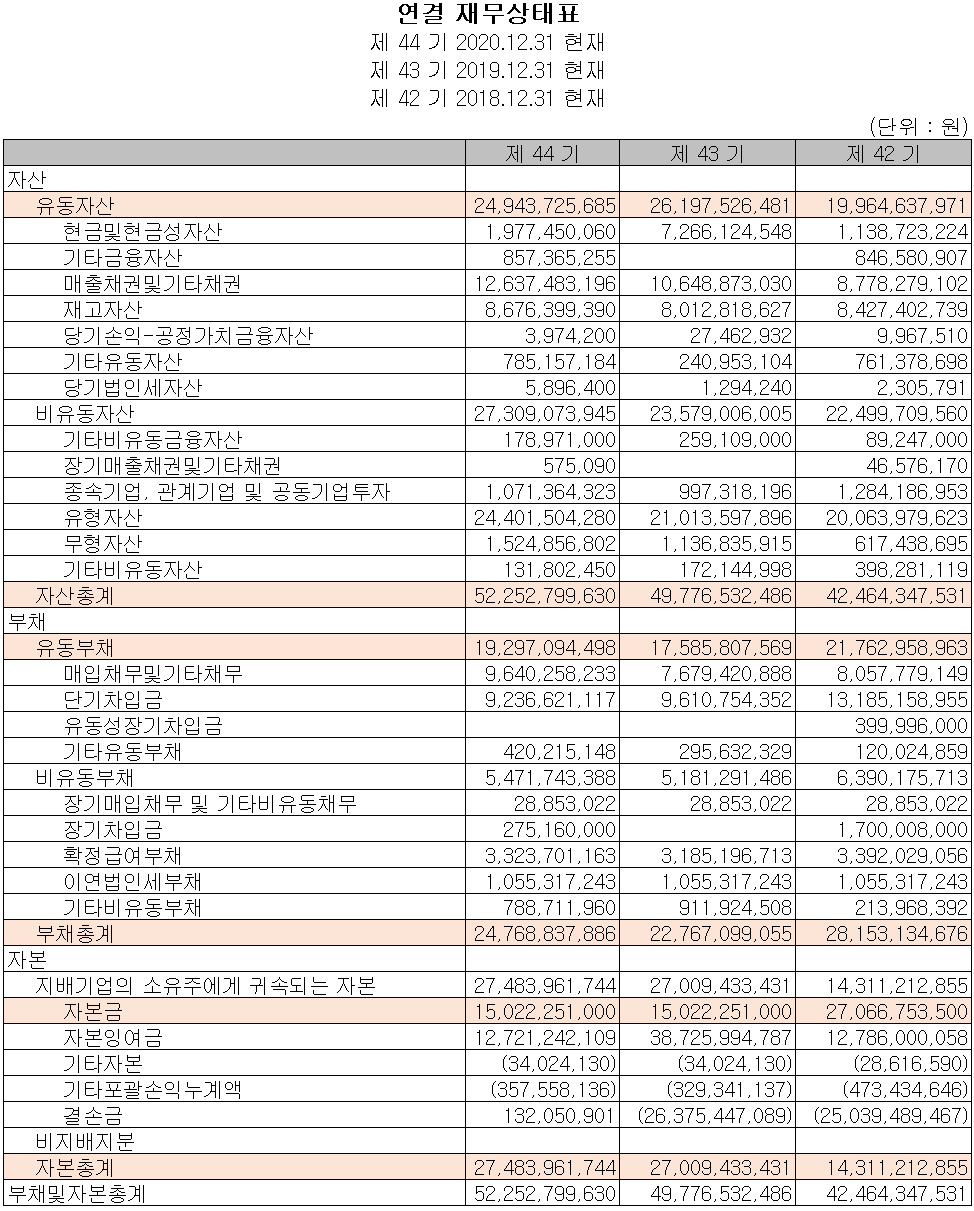 2020년 당기 말 자산총계는 전년 대비 5%(25억 원) 증가한 523억 원으로 현금성 자산의 감소에 따른 유동자산은 감소했으나 설비투자에 따른 유형자산의 증가로 전체 자산이 증가했습니다. 부채는 8.8%(20억 원) 증가한 248억 원으로 매출 증가에 따라 매입채무의 증가가 있었습니다.