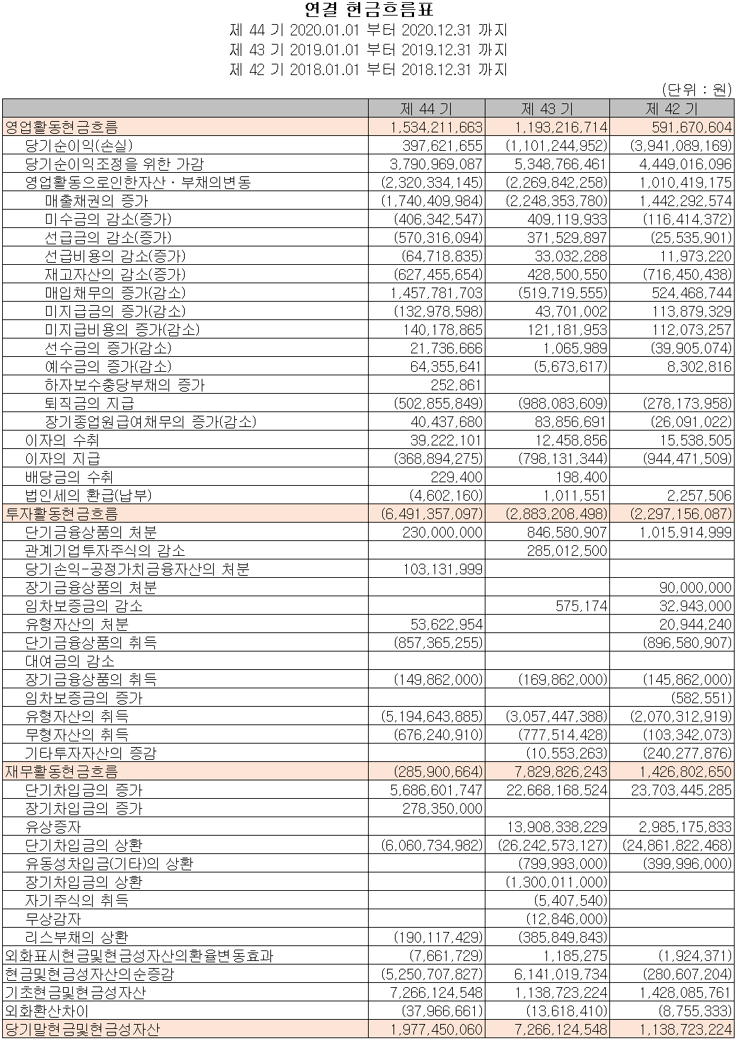 2020년 당기 말 기준 영업활동 현금흐름은 전년 대비 3.4억 원이 증가한 15억 원이 유입되었으며, 장단기 차입금을 조달하여 부채를 상환하였습니다. 투자활동에서는 유무형 자산의 취득으로 64억 원의 현금이 유출되었습니다. 2020년 당기 말 당사의 현금 및 현금성 자산은 19.8억 원입니다.