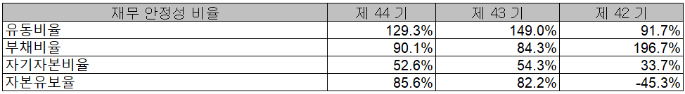 당사의 2020년 재무 안정성 비율에서는 유동비율 129.3%, 부채비율 90.1%, 자기자본비율 52.6%, 자본유보율 85.6%를 기록하였습니다. 지난 2018년(42기) 전기차 및 수소차의 성장 전망에 따른 PECAP의 설비 투자 확대로 부채비율이 200%에 육박했으나 현재 100% 이하로 유지하고 있으며, 해당 투장에 따른 수요가 증가 추세에 있어 점차 안정적 재무구조를 보여줄 것으로 예상하고 있습니다.