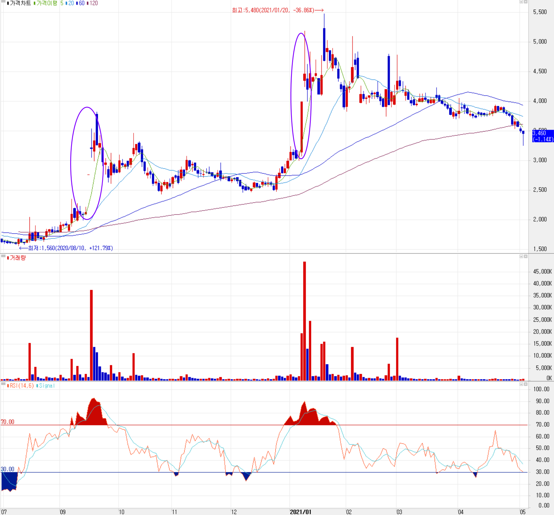 5월 4일 장 종료 기준 당사의 주가는 어제보다 1.14% 내린 3,460원에 거래를 마쳤습니다. 2020년 3월 코로나19 팬데믹 쇼크로 잠시 하락한 주가는 빠르게 반등하였으나 한동안 횡보하다가 지난해 하반기부터 상승 곡선을 그리기 시작했습니다. 외국인 비중은 1.18%이며, 시가 총액 1,040억 원으로 코스닥 시총 상위 889위 종목입니다.