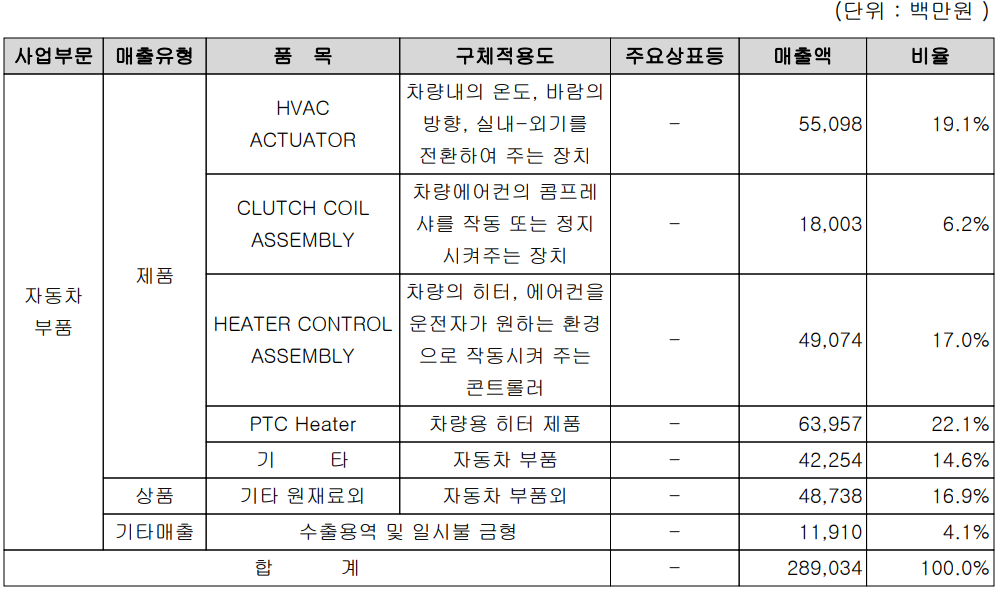 당사는 자동차 부품 단일 사업부문을 영위하고 있으며, 차량용 공조시스템의 핵심 부품인 HVAC Actuator, Clutch Coil, Heater Control Assembly 및 PTC Heater 등을 제조, 공급하고 있습니다. 지난해 제품별 매출 비중에서는 HVAC Actuator 19.1%, Clutch Coil 6.2%, Heater Control 17% 그리고 당사의 주력 제품인 PTC Heater가 22.1%를 나타냈습니다.