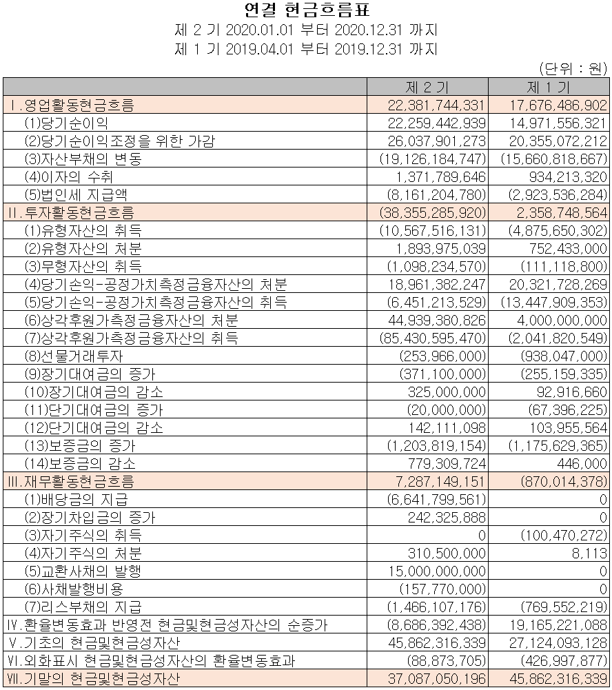 영업활동 현금흐름은 순이익의 증가로 224억 원의 현금이 유입되었으며, 사채의 발행 및 장기차입금을 조달하여 부채를 상환하고 배당금을 지급하였습니다. 또한 연구개발 및 설비투자를 위한 유무형 자산에 투자하였습니다. 2020년 당기 말 기준 당사의 현금 및 현금성 자산은 371억 원입니다.
