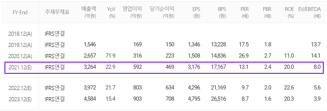 당사의 2021년 예상실적은 매출액 3,264억 원으로 전년 대비 22.9% 증가하고, 영업이익은 592억 원으로 87.3% 증가, 당기순이익은 469억 원으로 110% 증가할 것으로 추정했습니다.