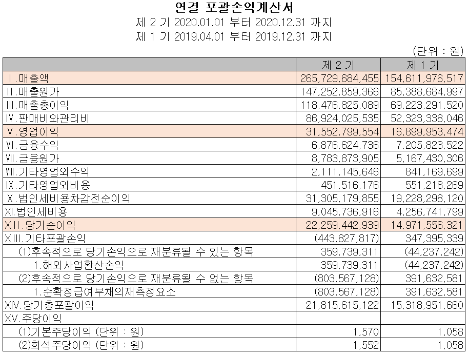 당사의 2020년 실적은 매출액 2,657억 원으로 전년 대비 71.9% 증가했고, 영업이익은 86.7% 증가, 당기순이익은 48.7% 증가했습니다. 2019년 4월 1일 피에스케이홀딩스로부터 인적 분할하여 설립되었기 때문에 2019년 실적은 3분기 분량만 계상되었으나 1년 치를 감안하더라도 전반적인 2020년 실적 개선이 있었습니다. 특히 당사의 Dry Strip 장비는 세계 시장 점유율 1위로서, 글로벌 장비 기업인 Lam Research와 경쟁하고 있는 제품으로 독보적인 기술력을 확보하여 꾸준한 수요 증가가 예상됩니다. 당사의 PR Strip 장비는 또한 NAND, DRAM, Foundry 등의 공정에 모두 적용할 수 있기 때문에 강력한 경쟁력을 보유하고 있습니다. 이러한 경쟁력으로 당기 중에도 신규 고객사를 확보하여 매출이 증가했고, 사내 원가 절감 노력으로 인한 이익이 증가하였습니다.