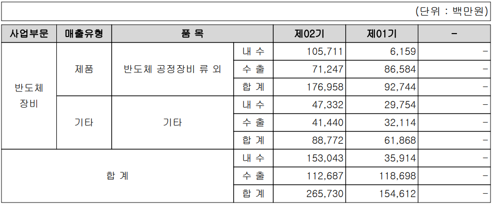 당사는 반도체 제조 공정용 장비의 개발 및 공급을 하는 단일 사업부문으로 반도체 전공정인 웨이퍼 공정 장비인 Dry Strip, Dry Cleaning, New Hard Mask Strip, Wafer edge clean, Etch Back, Power Device Etch 등을 제조, 공급하고 있습니다. 매출 유형은 제품과 기타 부품 및 용역 수수료로 구분되어 있습니다. 지난해 당사의 반도체 공정용 장비의 매출 은 전체 매출의 66.6% 기타 매출은 33.4%의 비중을 나타냈습니다. 전반적으로 내수의 비중은 57.6%, 수출은 42.4%를 보이고 있습니다.